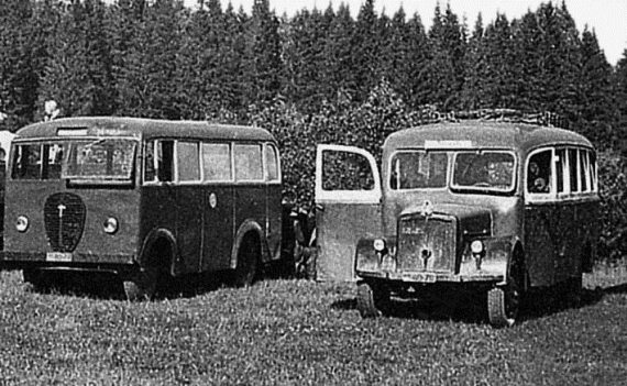 Трофейные автобусы на шасси 3-тонного «Круппа» (справа) и английского «Торникрофта». Эстония, 1950-е годы.