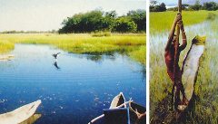 Лицо дельты постоянно меняется — с каждым годом и сезоном. И причина тому — сама река и ее исконные обитатели. Термиты строят острова, а бегемоты прокладывают протоки к островам — местам новых пастбищ. По этим протокам, через тростники, пробираются редкие посетители тех глухих мест. Единственным средством передвижения служат туземные пироги, выдолбленные из стволов деревьев, — «мокоро». Благодаря узкому, вытянутому корпусу они могут двигаться среди зарослей папируса, правда, если заросли не слишком густы.