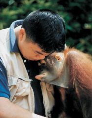 Есть как минимум два различия между человеком и животным: употребление орудий труда и использование речи. Так вот, когда идет дождь, орангутаны накрываются большими листьями, как зонтами. Чешут спины палкой с загогулиной на конце. Извлекая мед из дупла, отламывают тонкую веточку и ковыряются внутри – так что с использованием инструментов все в порядке. А последние эксперименты в Сепилоке по обучению молодой самочки азбуке глухонемых показывают, что языковые способности орангутанши похожи на способности человека в возрасте двух-трех лет. Она может спросить про объект, который отсутствует в данный момент, или построить свою собственную конструкцию. Например, назвать кричащего по утрам петуха «плохо-птичка», а раствор для контактных линз – «глаз-вода». Во время игры она кладет за щеку ластик, притворяется, что глотает его, открывает рот и показывает знаками: «еда-кушать». Конечно, она скрывает ластик за щекой и позже его вынимает. И при этом мы еще спорим: от кого произошел человек?