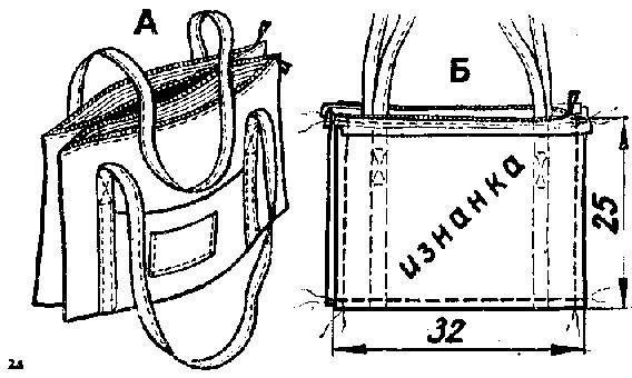 Рис. 2. Модель 2: А — общий вид и основные размеры; Б — изготовление кармана; В — изготовление донышка