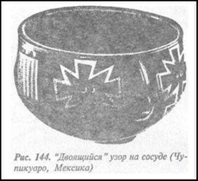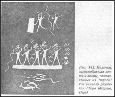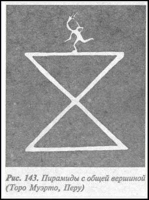 Еще один удивительный рисунок заслуживает серьезного изучения, поскольку дает, как мне кажется, возможность понять некоторые мексиканские символы. Два треугольника, соприкасающихся в пространстве вершинами — и бегущий по основанию верхнего человечка с головкой клеточкой и тремя волосинками. Да ведь это же — показалось мне — формула жизни! Организм— тоже треугольник или пирамида, — на рисунке внизу, — вырастающей из миллиардов клеток ради того, чтобы на вершине ее оказалась только одна клетка — конечная цель развития, ее венец: яйцо. Оно начинает делиться и преумножением созидать новое тело — новую пирамиду от вершины предыдущей, из точки связи двух поколений В определенной мере подтверждением такого толкования этого символического рисунка может быть похожий на него орнамент на керамическом сосуде из Чупикуаро в Мексике. На нем точку соприкосновения вершин треугольников-пирамид удвоили, как бы показывая тем принцип возникновения нового организма. Для равновесия, да и по смыслу его, знаку придали еще два треугольника, лежащих горизонтально, с тем же значением удвоения тела, благодаря чему в целом получилось некое подобие креста. Изображение завершают четыре луча, как бы указывающие направления распространения жизни: вовне от центра — места двойственности — на все четыре стороны света.