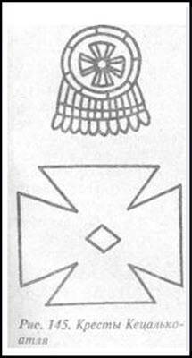 Графическое родство с этими знаками — пирамида и звезда — очевидно и в многочисленных крестах, названных «крестами Кецалькоатля»; поэтому не исключено, что в них отображена та же мысль. С нею, похоже, соотносятся и те изображения из кодекса Виндобоненси, где из основания, образованного двумя хромосомами, вырастает организм в виде пирамиды.
