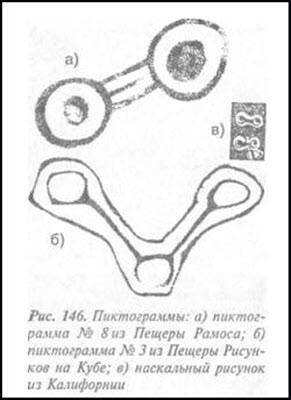 Я считал, что черная пиктограмма № 8 из Пещеры Рамоса на полуострове Кагаунес отображает принцип деления клеток, снабженных ядрами и связанных двойной лентой или двойной палочкой, что наглядно передает идею наличия в обеих клетках сестрах идентичной хромосомной информации.