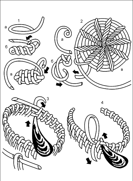 Рис. 33. Спиральное плетение из корней: а, б, в – этапы работы: 1 – плетение овального донышка; 2 – плетение круглого донышка; 3 – плетение стенок корневушки и способ наращивания спирали; 4 – оплетение края корневушки
