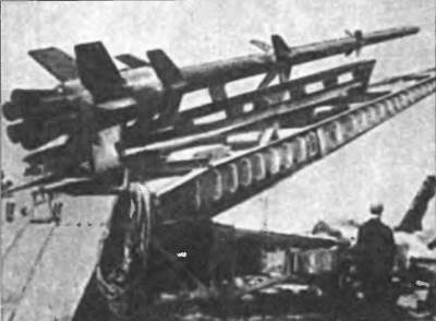 Hs-293 (рис. 2.41) часто называют планирующими бомбами, что неточно: все модификации имели ракетные двигатели. Вес этих крылатых ракет приближался к тонне, причем около половины приходилось на боевую часть. Системы управления были в основном радиокомандными (только ракеты модификации С2 управлялись по проводам). Ракеты отличались конструкциями органов управления, типами двигателей и боевых частей. Среди последних были и «ныряющие», поражающие днище корабля. Задумка-то была вроде и оригинальной, но, «воплощенная в крылатый металл», оказалась столь капризной, что советские специалисты, установившие было такие боевые части на послевоенной противокорабельной ракете КСЩ, впоследствии отказались от них. На германских заводах преимущественно производилась модификация HS-293A: 1700 шт. Их применяли в Бискайском заливе, при высадках союзников у Анцио и Салерно, против конвоев, шедших к Мальте и в Арктике. Конструкция Hs-293 была сочтена успешной, последовали и другие: Hs-294, Hs-295, но они «опоздали». Контрмеры союзников сводились к постановке помех в рабочих диапазонах радиочастот, а также к борьбе с самолетами-носителями, что было не очень сложным, ввиду небольшой дальности применения управляемых ракет.