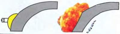 Разрабатывались и специальные пластичные взрывчатые составы для использования в бронебойных снарядах. Идея заключалась в том, чтобы не пробивать броню, а, обеспечив плотное прилегание к ней ВВ после попадания снаряда — сформировать ударную волну. На обратной стороне бронезащиты ударную волну сменяет волна разрежения, вызывающая откол частиц брони, обладающих определенным поражающим действием (рис. 2.39). Из стадии опытных германские работы не вышли, но позже снаряды с деформируемой головной частью входили в боекомплекты французских танков. Такие снаряды потеряли свою эффективность, когда на танки стали устанавливать многослойную броню.