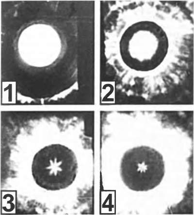 Стрелочки изготовили из самого тугоплавкого металла — вольфрама. Это мало повлияло на результат: на блоке из алюминия, служившем мишенью, осталась лишь неглубокая вмятина от близкой детонации взрывчатого вещества, содержавшегося в ИВМГ. Напрашивалось предположение, что причиной испарения стрелочки был нагрев ее вихревыми токами, индуцируемыми в вольфраме сильным магнитным полем (проводимость его втрое ниже, чем у меди и глубина проникновения поля (скин-слоя) для микросекундного времени сжатия превышала сотню микрон). Тогда в приповерхностный слой вольфрама с помощью установки ионной имплантации внедрили частицы углерода, а поверх — еще и десятимикронный слой очень хорошо проводящего серебра. Это позволяло надеяться, что почти все магнитное поле (и ток) будет сосредоточено в слое серебра. Серебро, конечно, должно было испариться, а углерод — хоть как-то воспрепятствовать теплопередаче в вольфрам. Участники опытов с восхищением рассмотрели блестящие, высокотехнологичные стрелочки. Потом прогремел взрыв и в алюминиевом блоке было, наконец, обнаружено отверстие. В него радостно тыкали иголками, наивно пытаясь что-то нащупать, но рентгеновский снимок мишени (рис. 4.14) показал, что кратер «чист». Даже небольшой кусочек вольфрама должен контрастно выделяться на фоне алюминия, но ничего подобного на снимке не было, а был просто полый канал, да еще чуть искривленный, что указывало на потерю устойчивости образовавшего его тела. Стрелочка летела, расходуя себя, испарения не удалось избежать, его просто замедлили. Провели еще один опыт, стрелочкой выстрелили в блок оргстекла, снимая процесс скоростной камерой. На проявленной пленке было видно, как нечто летит, оставляя за собой конус из помутневшего от ударной волны оргстекла, а потом все поле съемки закрывали трещины. И эти снимки сохранились, но разобраться в них, не являясь специалистом, непросто; они позволили определить скорость того, что поначалу оставалось от стрелочки — 4,5 км/с и дистанцию, на которой от нее не оставалось ничего — несколько сантиметров. Газокинетический барьер вроде и удалось обойти, но за ним стоял другой — тепловой.