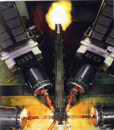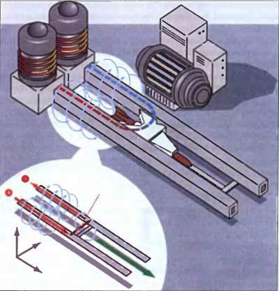 В этих устройствах разгон метаемого тела происходит на дистанции, превышающей десяток метров, что, конечно, исключает их применение в боевых частях управляемого оружия (рис. 4.12, 4.13). Обычным же для боеприпасов метанием с помощью контактного взрыва требуемых скоростей не достичь: мешают газокинетические ограничения (тепловые скорости молекул в газах взрыва становятся сравнимыми со скоростями метаемых тел). Идея Соловьева заключалась в том, чтобы обойти газокинетический барьер, метнув поражающий элемент магнитным полем — оно, в отличие от молекул газов, распространяется со скоростью света.