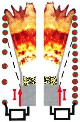 По мере дальнейшего движения конуса, преимущество «профилированного» варианта будет возрастать, потому что в каждом из последующих его участков будет течь больший начальный ток. Если нагрузка подобрана правильно («согласована») и усиление продолжается вплоть до закорачивания расширяющейся трубой последнего витка (рис. 4.17), «левый вариант» имеет все предпосылки не только компенсировать начальное энергетическое преимущество «правого», но и далеко превзойти его. Настырный может задать вопрос: «А где же предел возрастания шага намотки от витка к витку?». Стоит вспомнить, что большой ток еще не гарантирует получения большой магнитной энергии, которая зависит не только от квадрата тока, но и от индуктивности. Так что, все более «круто» профилируя обмотку (и уменьшая при этом индуктивность), можно прозевать момент, когда ВМГ вообще перестанет усиливать энергию и даже начнет терять ее, несмотря на значительный генерируемый ток!