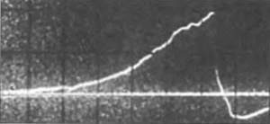 Индуктивность нагрузки тоже должна быть «встроена» в закон изменения индуктивности спирали. Любые попытки «по-новому» нагрузить СВМГ изменят этот закон, но когда «очень нужно», нагрузку все же меняют, как это не раз приходилось делать и автору. На начальных стадиях работы, пока индуктивность спирали велика, несогласованность нагрузки не будет ощущаться, но в конце работы отклонения от выбранного закона станут заметными и приведут к потерям потока (рис. 4.20), хотя на «свою» нагрузку спираль эффективно работала до последней микросекунды. Опять же. когда «очень нужно», повышают и начальный ток сверх расчетного, что чревато пробоем и получением просто жалкого тока в нагрузке (рис. 4.21). Иногда без изменения нагрузки не обойтись, но мучительно не хочется менять что-нибудь в уже доказавшей свою эффективность, подобранной с таким трудом обмотке. Перейти на меньшую индуктивность нагрузки — не проблема, просто надо добавить к спирали одну-две секции с большими шагами намотки, продолжив зависимость рис. 4.18, до согласования с новой нагрузкой (при этом, если не требуется большее усиление, можно «отбросить» такое же число секций с наименьшими шагами намотки). Хуже (но чаще встречается), если индуктивность новой нагрузки больше, чем «согласованное со спиралью» значение — тогда ту же зависимость придется продлевать в сторону меньших шагов и все более вероятной станет встреча с «перескоком» (рис. 4.22): незаметная глазу несоосность трубы и спирали приведет к тому что точка контакта будет не плавно скользить по каждому витку, а «перескакивать» на некоторых участках, опять же — транжиря драгоценный магнитный поток.