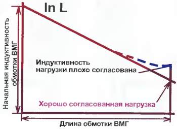 Обычно изоляция провода постоянна по толщине, а значит и рабочее напряжение рационально делать постоянным. Для этого случая теоретическое рассмотрение приводит к экспоненциальному закону возрастания шага намотки с длиной. По мере движения точки контакта к нагрузке, уменьшается экспоненциально и индуктивность спирали, поэтому удобно рассматривать зависимость логарифма индуктивности от длины — это будет прямая линия (рис. 4.18).