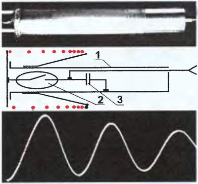 Подобрать обмоточные данные спирали, соответствующие теории, непросто. Расчет соленоидов с переменным по длине шагом намотки (а иногда — и переменного диаметра) ненадежен из-за трудности учета взаимной индуктивности витков и граничных эффектов. Прибор (рис. 4.19) позволяет решить эту проблему «в лоб», осциллографированием периода ударно-возбужденных колебаний в контуре. В металлической трубке 1 размешаются два элемента: коммутатор 2 и конденсатор 3. Когда коммутатор срабатывает, возникают колебания в контуре, включающем эти два элемента и исследуемую индуктивность. Вычислить индуктивность по их периоду не составляет труда (при этом учитывается собственная индуктивность прибора, определенная в режиме, когда он был «закорочен»). На трубку можно надеть конус со скользящим контактом, имитирующий расширяемую взрывом трубу СВМГ. Начав процесс измерений с нагрузки, можно изменять шаг витков секций, подбирая требуемый закон изменения индуктивности соленоида по его длине.
