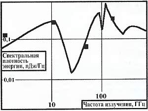 Закон усиления тока в спирали, замыкаемой трубой, известен из трудов А. Сахарова. Бешеные «впрыскивания» тока ломают форму колебаний (рис. 4.38в), а луч осциллографа слишком медлителен, чтобы воспроизвести ее скачки. Достоверна лишь огибающая — линия, соединяющая токовые амплитуды. Она служит для их нормировки, когда ток представляют как сумму уже «чистых» синусоид (гармоник). Остальное понятно: для каждой гармоники тока известной частоты и амплитуды вычисляют мощность излучения через витки обмотки, в данный момент еще не закороченные ударом трубы. Доля гармоник с частотами от сотен до десятков тысяч мегагерц (много большими частоты «несущей» волны) к концу работы существенно возрастает (рис. 4.39), растут и потери на излучение, «подсаживая» ток (рис. 4.38а). Пиковая мощность излучения ВМГЧ меньше, чем у ЦУВИ, но время генерации (десятки микросекунд) на четыре порядка больше и энергия РЧЭМИ даже выше.