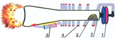 …«Доведенные» УВИС продемонстрировали надежную и стабильную работу, но сложность сборки и наличие весьма дорогой в производстве сферической детонационной разводки повышали их стоимость до уровня, немыслимого для неядерных боеприпасов. Прототип электромагнитного боеприпаса — 105 мм реактивная граната с боевой частью на основе УВИС (рис. 4.36) — был создан и успешно испытан, но такой боеприпас не имел шансов стать массовым: его можно применять только в особо ответственных случаях, для поражения важных целей, а на поле боя нужно другое оружие — «числом поболее, ценою подешевле». Параллельно с ударно-волновыми излучателями, разрабатывались и генераторы частоты…
