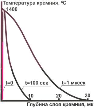 В общем-то, это и так должно быть ясно: чем короче токовый импульс, наведенный РЧЭМИ, тем меньше теплоотвод or того элемента, в котором реализуется энергия этого импульса, но оценить численные значения стоит. Пусть весь тепловой эффект сосредоточен в области р-n перехода (размеры которого — около микрона). Тогда импульс бесконечно малой длительности (при которой повышение температуры кремния на расстоянии, сравнимом с микроном, пренебрежимо), нагревающий до данной температуры пластину данной площади, должен иметь определенную энергию, которая при дальнейших расчетах принималась равной единице (кпд равен 100 %). Если же энергия выделяется на той же глубине, но в течение большего времени, (рис. 4.48) существенным становится теплоотвод и для достижения той же температуры нагревать придется уже не микронный слой р-п перехода, а и близлежащие слои кремния, что ведет к снижению кпд. В результате расчетов была получена зависимость кпд различных временных режимов облучения, из которой следовало, что режимы более длительные, чем единицы микросекунд, не являются рациональными, энергосберегающими (рис. 4.49). Существует, правда, и другой механизм выхода р-n перехода из строя (пробой), но он реализуется только при наносекундных длительностях облучения, характерных для ударно-волновых излучателей, а не для генераторов частоты. Таким образом, режим излучения генераторов частоты нельзя признать эффективным с точки зрения нанесения поражений электронике противника, но зато устройства этого класса значительно проще и надежнее других и по параметру «эффективность/ стоимость» они вполне конкурентоспособны.
