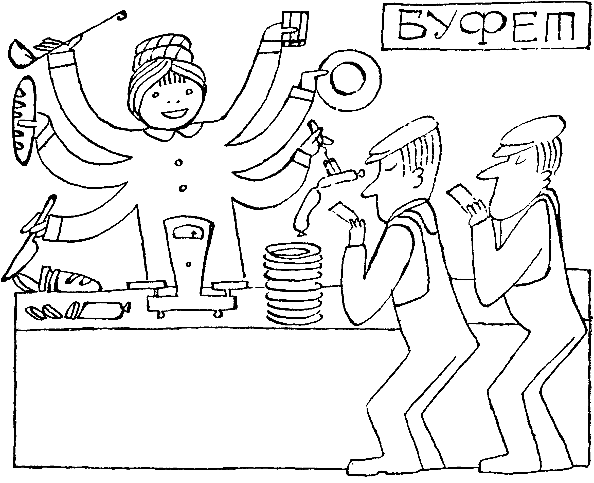 Вы замечаете, что по мере того, как очередь приближается к прилавку, разговоры вокруг вас стихают. Все смотрят, как работает буфетчица. И вы смотрите. Вы не слышите очередного заказа, но вам и не надо его слышать. Вы все видите.