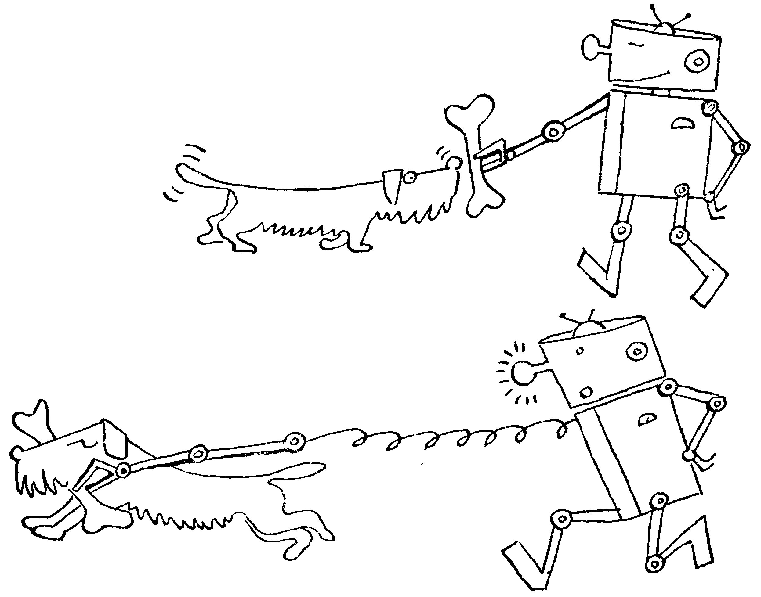 "Очувствленный" робот должен быть оснащен системой искусственного интеллекта. Только при этом условии он может полезно использовать эффект очувствления. Мы надеемся, что вы теперь сами сумеете сопоставить достигнутый в этих опытах уровень "интеллектуальности" робота с уровнем естественной интеллектуальности, сами увидите, насколько пока далеки копии от оригинала. И не будете этому удивляться, представляя себе всю сложность задач робототехники. Не будете удивляться тому, что хотя со времени первых опытов прошло уже 15–20 лет, до сих пор еще не существует тех настоящих роботов, которых, может быть, рисует ваше воображение.