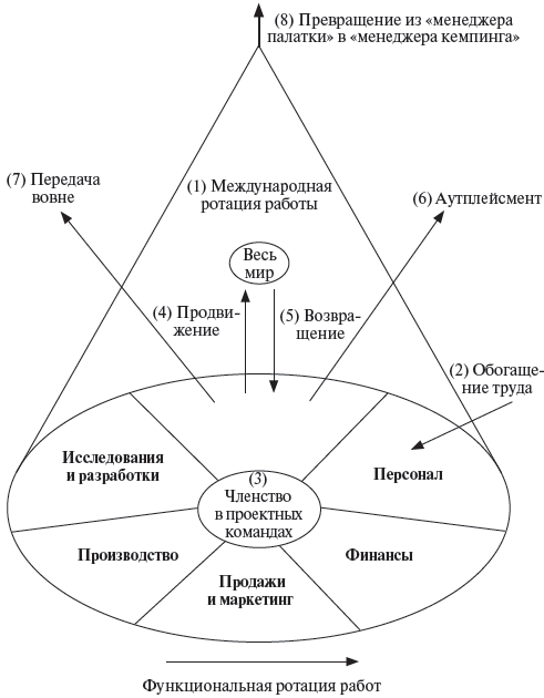 Еще одно из представлений о карьере связано со структурой персонала современной организации, работающей чаще всего в сфере услуг или не имеющей постоянных заказов (рис. 10.2). Наличие ядра и периферии обеспечивает организации профессиональную (функциональную) гибкость и гибкость по численности. Движение от периферии к ядру организации также рассматривается как карьерное развитие.