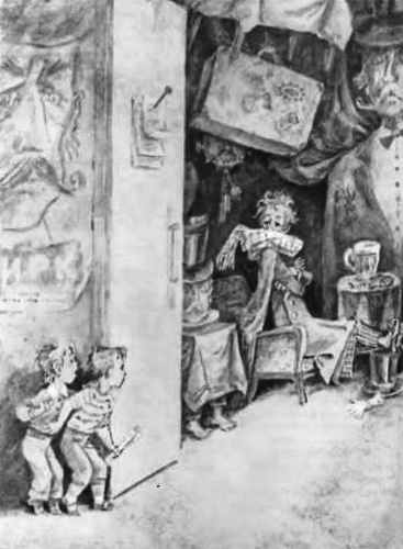 Тёмная комната вся сплошь была заставлена такими странными предметами, что ребята сначала даже испугались. Тут стояли ящики на колёсах, восковые фигуры, цилиндры, детская коляска, ведро и множество предметов других. Часы были похожи на барабан, стол висел на верёвочке, и к нему был приделан чемодан. На столе стояла стеклянная банка, и в ней лежал сапог.