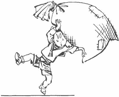 Стёпка сбегал в сарай и принёс оттуда большой мешок из-под муки. И в этот мешок мы стали собирать вещи, нужные для далёких путешествий. Мы положили в мешок хлеб, и сахар, и кусочек сала, потом положили разную посуду — тарелки, стаканы, вилки и ножи. Потом, подумавши, положили цветные карандаши, волшебный фонарик, глиняный рукомойник и увеличительное стёклышко для зажигания костров. И, кроме того, запихали в мешок два одеяла и подушку от тахты.