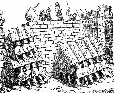 Турн, окрыленный удачей, воинству приказал начать на лагерь атаку. К стенам бойцы подступили, засыпая рвы и окопы. Сверху на них троянцы валили огромные камни, круша черепаху, какую италийцы сложили из медных щитов.