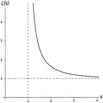 Некоторую ясность может внести график. На рисунке 5.4 показан график дзета-функции. Как видно, когда аргумент sприближается к 1 справа, значения функции убегают на бесконечность, а когда sсамо уходит на бесконечность далеко справа, функция все более и более приближается к 1. (Я пририсовал еще два пунктира: линию s = 1 и график постоянной функции.)