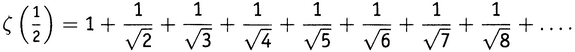 С отрицательными числами дело обстоит еще хуже. Каково значение выражения (5.2) , если sравно -1? Из 5-го правила следует, что 2 – 1— это просто 1/ 2, 3 – 1— просто 1/ 3и т.д. Поскольку 1: 1/ 2есть просто 2, 1: 1/ 3— просто 3 и т.д., наш ряд принимает вид 1 + 2 + 3 + 4 + 5 + …, что определенно расходится. А как насчет s= 1/ 2? Поскольку 2 1/2— это просто 2 и т.д., ряд принимает вид