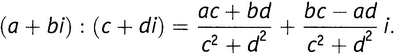 Деление основано на нехитром приеме. Что такое 2: i?. Ответ: запишем это в виде дроби, как 2/ i. Чудесное свойство дробей состоит в том, что одновременное умножение и числителя, и знаменателя на одно и то же число (не равное нулю) не изменяет дроби: 3/ 4, 6/ 8, 15/ 20и 12 000/ 16 000— это все разные способы записи одной и той же дроби. Итак, умножим числитель и знаменатель дроби 2/ iна - i. Умножение двойки на - iдаст, конечно, -2 i, а iумножить на - iесть - i 2, то есть -(-1), что равно 1. Следовательно, 2/ iравно -2 i/1, что есть просто -2 i.