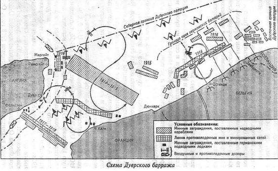 Постепенно заграждения начали выползать за пределы Дуврского пролива. В апреле – мае 1916 года минированные сети были поставлены вдоль бельгийского побережья от Ньюпора до Шельды. Предполагалось, что это заграждение помешает малым подводным заградителям серии UC-I действовать из бельгийских портов. Конечно, действия германских лодок были несколько затруднены, но британские мины показали себя настолько ненадежными, что ни одна лодка на этом заграждении не погибла. Адмирал Бэкон совершенно ошибочно приписал прекращение атак против торговых судов постановке данного заграждения. Это подтолкнуло его осенью 1916 года заняться постановкой аналогичного заграждения поперек Дуврского пролива.