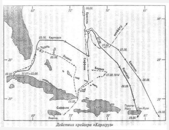 В поддень 8 августа запасы топлива на "Карлсруэ" составляли: 112 тонн угля и 31 тонна нефти. Так как крейсер тратил 5,6 тонны угля в час даже при скорости 10 узлов, добраться до гавани было трудно. Наблюдатели пытались разглядеть, не видны ли дымки британских крейсеров. У Кёлера оставалось так мало топлива, что он не мог позволить себе увеличить скорость даже в случае появления противника. В этот момент любой британский броненосный крейсер серии "Графств" легко уничтожил бы "Карлсруэ". 9 августа в 6.00 германский крейсер дополз до гавани Сан-Хуан де Пуэрто-Рико, имея в бункерах менее 20 тонн угля.