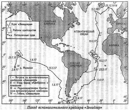 21 декабря 1916 года "Зееадлер" покинул устье реки Везер, намереваясь пройти вдоль побережья Норвегии, обогнуть с севера Шотландию и выйти в Атлантику обычным судоходным маршрутом. Но 23 декабря корабль попал в жестокий шторм. Фон Люкнер расценил этот как дар божий, потому что теперь подмоченные документы не вызывали подозрений. 8 день Рождества фон Люкнер находился в 180 милях юго-западнее Исландии, когда был остановлен британским вспомогательным крейсером "Авенджер". Имея 8 орудий 152 мм, этот корабль мог в считанные минуты превратить "Зееадлер" в груду щепок. Англичане прислали досмотровую партию, но тщательная маскировка сработала. Лейтенант Лейдерман (Отставной лейтенант Лейдерман до 1914 года служил у знаменитого владельца винджаммеров "Летающие П" Фердинанда Лайеша и имел большой опыт плавания на парусных судах. Бунич почему-то перекрестил его в Пирса и разжаловал в младшие лейтенанты. Может быть, он спутал его с изображавшим боцмана лейтенантом Прайссом?) рассказал англичанам сказку о немецких рейдерах "Мёве" и "Зееадлер". Хотя осмотр был довольно тщательным, немцы приготовились к нему более чем основательно.