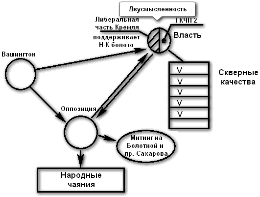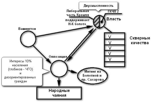 Теперь давайте всмотримся опять в эти политические картинки. Итак, мы имеем дело с Перестройкой-2, при которой КАК МИНИМУМ — подчеркиваю, как минимум — либеральное крыло власти ВМЕСТЕ с американцами спонсирует и поддерживает ИМЕННО немцовско-касьяновскую оппозицию. И всё это видно. Ну, видно! Снова посмотрите на факторы, которые я [уже] назвал. Большие средства массовой информации бездействуют (все эти госканалы, которые были накалены)? — Бездействуют. «Единая Россия» бездействует, как в рот воды набрала? — Как в рот воды набрала. Всякие охранительные структуры («Наши» и т. д.) бездействуют? — Бездействуют. А кто их остановил? КТО ИХ остановил? Они же ВСЕ естественным путем рвались с поводка! Так же, как деятели КПСС и верные коммунизму граждане с тем, чтобы отстоять СВОИ идеалы, а им говорили: «Цыц! Молчать! Нельзя!» Кто это сделал, лорды? Это же не ЦРУ сделало! И не Хилари Клинтон с Бараком Обамой. Это ЗДЕСЬ где-то происходит! Но ведь это факт? — Факт. ЧТО представляет собой оппозиция? Не народные чаяния она собой представляет, а интересы 10 % населения (этих самых глобиков, членов Глобального общества) и дезориентированных граждан, которые потом опять будут говорить: «нас обманули». Хватит. Хватит рассуждать наивным образом и потом оправдывать себя наивностью. Пора понимать, что к чему!
