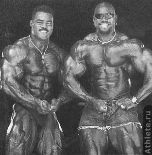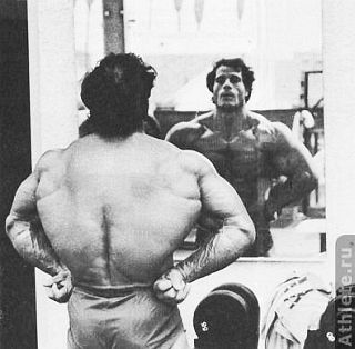 Лучший способ учиться позированию - работа с другими культуристами. Здесь Жан-Пьер Фукси Насер эль-Сонбатипроверяют мускулатуру Фукса перед зеркалом.