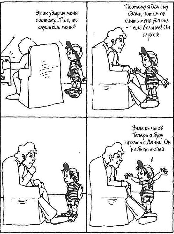 Далее, на рисунках, вы увидите контраст между эти ми приемами и тем, как обычно люди отвечают детям, если у них проблемы.