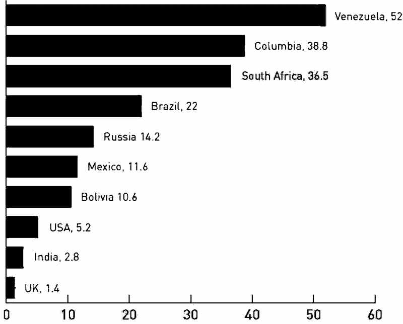 Обстоятельства сопротивления судебной системы ЮАР очевидно для любого наблюдающего за повседневной деятельностью уголовных судов. Согласно отчетам полиции, в Южной Африке совершается 19000 убийств в год, что является одним из самых высоких показателей в мире (см. рис. 3.1). Подобные показатели характерны и для других категорий насильственных преступлений. Судебная система сильно перегружена с судебными процессами, во многих случаях тянущимися до года (van Zyl 2009).