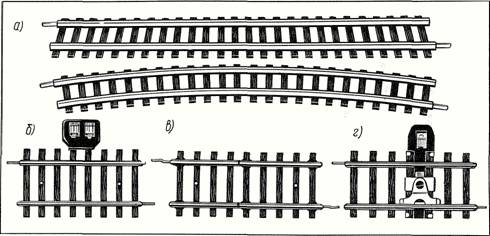На макетах железных дорог конструкция верхнего строения пути значительно упрощена. Международными нормами установлена ширина колеи — 9; 12; 16,5; 32 и 45 мм, что соответствует определённому масштабу модели железной дороги. Предприятия, изготавливающие модели железных дорог, делают звенья железнодорожного пути различной длины, для прямых и кривых участков, рельсы, шпальную решётку, стрелочные переводы, глухие пересечения, тупиковые упоры, элементы инженерных сооружений и др. Звенья пути (рис. 38, а) состоят из шпальной решётки, соединенной с рельсами. Шпальную решётку обычно изготавливают из пластмассы, она служит изолятором для рельсовых нитей, по которым проходит электрический ток для питания электродвигателей моделей локомотивов. Для подведения к рельсам электрического тока служат специальные звенья пути с выносными контактами (рис. 38, б). Кроме того, изготавливают звенья с изолирующими вставками (разрывами) на одной или двух рельсовых нитях (рис. 38, в), с рельсовой педалью (контактом, рис. 38, г), подающей сигнал о прохождении поезда. Особенности применения этих элементов рассмотрены в главе V.