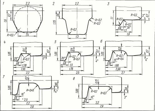 Рис. 41. Профили фасонных резцов (1 — 8) для изготовления рельсопрокатных валков (масштаб 1:87)