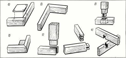 а — впритык; б — в ус; в — усиленное в ус; г — под углом сквозным шипом; д — примыкание под углом сквозным шипом; е — накладкой вполдерева