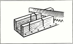 Разметку и отпиливание брусков под углом лучше всего производить при помощи несложного приспособления — ярунка (рис. 19), собираемого из трёх толстых досок. Стенки должны быть совершенно параллельны друг другу, В них делают отвесный пропил, достигающий дна и направленный под углом 45° к стенкам. Второй такой же пропил выполняют, немного отступив, под тем же углом, но направленным в противоположную сторону. Наконец, третий пропил (средний) производят под прямым углом к стенкам и дну. Это приспособление облегчает работу при постройке подмакетника и при дальнейшем строительстве макета, когда потребуется множество брусков различных размеров и линий обрезов.