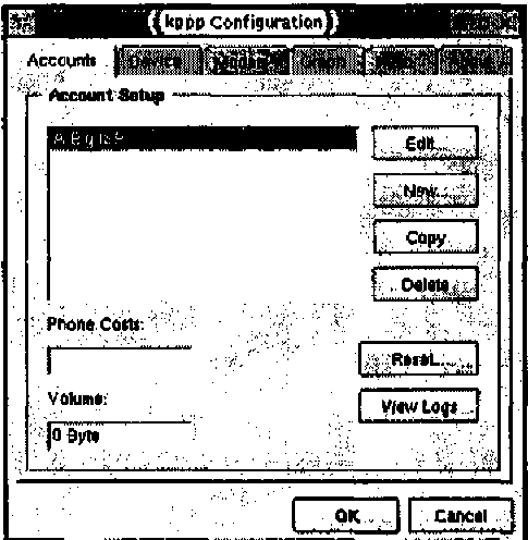 1. Щелкните на кнопке Setup. В появившемся диалоговом окне KPPP Configuration (рис. 2.5) вам надо ввести основные параметры, определяющие особенности установления соединения.