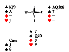 Счёт правильный — Юг и Восток могут взять пять взяток из шести. Запад контролирует пику и трефу, а у нас есть угрозы в обеих этих мастях. Сквизующей картой может стать либо черва, либо бубна. Которая из них? Черва, поскольку она находится в руке напротив двухкарточной угрозы. Две бубны нужно отобрать немедленно, а затем пойти червой и «удавить» Запада второй червой. Если мы сыграем картами в другой последовательности, то на вторую черву Запад снесёт валета бубён, а Восток вынужден будет решать проблему сноса одной из чёрных карт уже на этой стадии розыгрыша. Что бы он ни снёс, сквиз будет разрушен. Достаточно заменить девятку бубён Юга на короля той же масти, чтобы проблема последовательности ходов отпала: