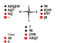 Запад на первой руке сказал «раз», но Юг после паса Востока вмешался в торговлю заявкой «мизер». Запад перебил девятерной, не купил ничего хорошего (пару бубён, которые тут же и снёс) и бодрым голосом заказал девять без козыря, лелея тайную надежду, что не завистуют. Восток спасовал, уныло глядя на свои обрезные фигуры в красных мастях, хотя и мелькнула туманная мысль, что Юг вряд ли решился бы на мизер с дублетом треф на чужом ходу. [178] Но сам Юг, недовольный тем, что «украли чистяк» (в прикупе-то были две бубны), решил рискнуть — ведь девятерная всё-таки вынужденная! Можно ли выиграть эту девятерную?