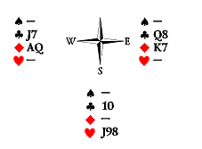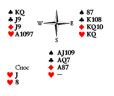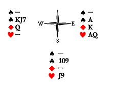 Если он снесёт туза треф, вистующие возьмут ещё две взятки на девятку треф и бубнового туза; если же он решит расстаться с «половинкой» бубнового марьяжа, Восток пойдёт в бубну, справедливо полагая, что дама треф была последней картой этой масти у Юга и, следовательно, туз треф у Запада, после чего туз и валет бубён возьмут две последние взятки. Без трёх.