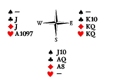 У вистующих не будет защиты от сквиза, в который они попадут после пятикратного откозыривания, если они не предпримут защитных действий уже на первом ходу. Юг должен прорезать бубну безотлагательно! Причём именно бубну, потому что прорезка трефы совпадает с интересами разыгрывающего, так как является для него корректировкой отдач. Убедитесь сами, разыгрывающий мог бы, если бы ход был его, сам пойти валетом или королём треф, отдавая ход Востоку. После червового или пикового ответа Востока Запад ходит в пику «до упора» и в четырёхкарточной концовке получает одну из двух возможных позиций. Либо это типичная позиция для впустки, в которой неважно в какой масти отдать взятку, чтобы получить в другой.