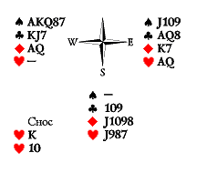 Первыми тремя ходами разыгрывающий собрал пики. Когда на третьем круге пик Восток снёс семёрку треф, Запад пошёл трефовым валетом, имея в виду следующие варианты на шестую взятку: либо наиграют короля червей, либо десятку треф. «Если следующий ход от Востока будет не в черву и не в трефу, а в бубну, — рассудил Запад, — то после получения взятки на бубновый марьяж я смогу пойти в трефу сверху и, если трефа не развалилась, отдать трефовую десятку и ждать хода в черву». Валета треф Юг взял королём и пошёл десяткой червей, «вырезая» короля и валета разыгрывающего. Восток добрал старшую черву и пошёл червой в третий раз (Юг два раза нёс бубну, а Запад на третью черву вынужден снести десятку треф). Теперь Восток ходит червой четвёртый раз, а Юг сносит даму треф. Запад попал в сквиз: