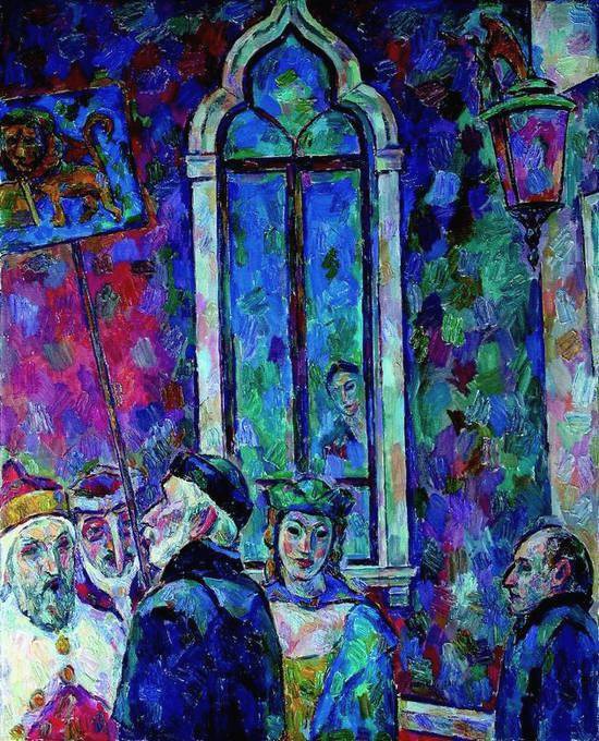 Вокруг – кобальт и пурпур, мрачное золото и старое серебро венецианских тканей, леденцовый пересверк цветного стекла, трепет черных и белых вееров, невесомое колыханье желтых, лиловых, лазоревых и винно-красных перьев и опахал.