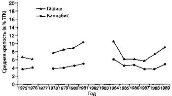 Средняя крепость (в % ТГК) разновидностей марихуаны (Правительственная химическая лаборатория, 1975–1989)