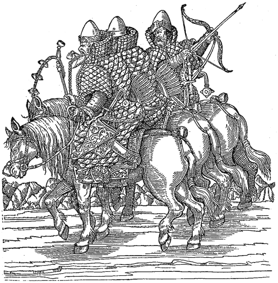 «Вооруженные всадники московиты», гравюра из книги Сигизмунда Герберштейна «Записки о Московии» (изд. 1556 г.)
