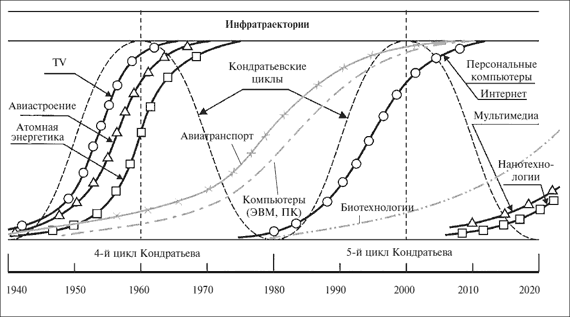 Иллюстрация 13. Диффузия инноваций вдоль подъемов циклов экономической активности Кондратьева.