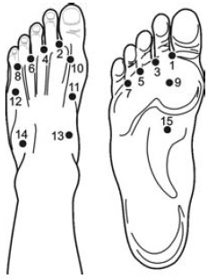 Обратите внимание на точку 9 (рис. 7, точки 9-14) на подошве стопы. Она расположена непосредственно позади выпуклости большого пальца. Массируя, регулируйте силу надавливания от сильного до среднего.
